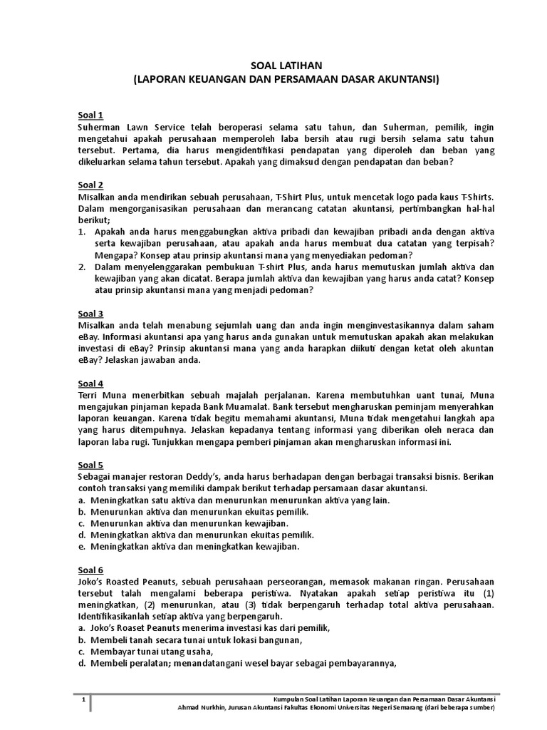 Dasar hukum dan pelaksanaan akuntansi jenis soal yang ada pada artikel ini ada tiga yaitu soal pilihan ganda soal esai atau uraian dan soal praktik. Persamaan ini digunakan untuk mereka yang ingin tahu usaha atau jasa mereka berjaan dengan menguntungkan atau tidak. Apabila ada tambahan setoran modal dalam tahun berjalan maka rekening prive harus di. Contoh soal dan jawaban persamaan dasar akuntansi dan laporan keuangan wwwcontohsoalnet soal akuntansi. Langsung saja berikut ini soal akuntansi tentang persamaan dasar akuntansi. Dasar dasar akuntansi meliputi pengertian akuntansi persamaan akuntansi contoh persamaan akuntansi dan jawaban.