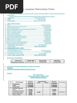 Contoh soal dan jawaban rekonsiliasi fiskal pdf. Contoh soal dan jawaban sewa guna usaha keputusan melakukan leasing atau tidak pt. Karena itu pemahaman atas rekonsiliasi fiskal ini sangat penting terutama untuk memudahkan dalam pengisian spt pph badan yang jatuh tempo setiap tanggal 30 april. Rekonsiliasi fiskal merupakan sebuah proses penyesuaian atas keuntungan komersial atau laba komersial yang berbeda dengan ketentuan fiskal dalam menghasilkan penghasilan neto atau laba yang sesuai dengan ketentuan pajak yang sudah di atur. Rafi bergerak dalam bisnis perdagangan kain batik yang merupakan wajib pajak badan yang berdomisili di pekalongan. Pt ajs merupakan wajib pajak badan yang berdomisili di jepara jawa tengah. Contoh soal dan jawaban rekonsiliasi fiskal demikian informasi yang dapat kami bagikan mengenai contoh soal pph badan dan koreksi fiskal beserta jawabannya.