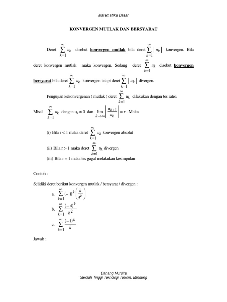 Contoh soal dan pembahasan deret konvergen dan divergen. Berikut ini merupakan soal dan pembahasan mengenai deret yang dipelajari pada perkuliahan analisis real. Quote by paul erdos mathematics is the surest way to immortality. Orang bodoh belajar ketika mereka terpaksa. Oleh karena itu pembahasan pada. Tetapi jelas konvergen ke 0. Tanpa panjang kali lebar alas kali tinggi mari kita come on masuk pada bahasan deret tak hingga.
