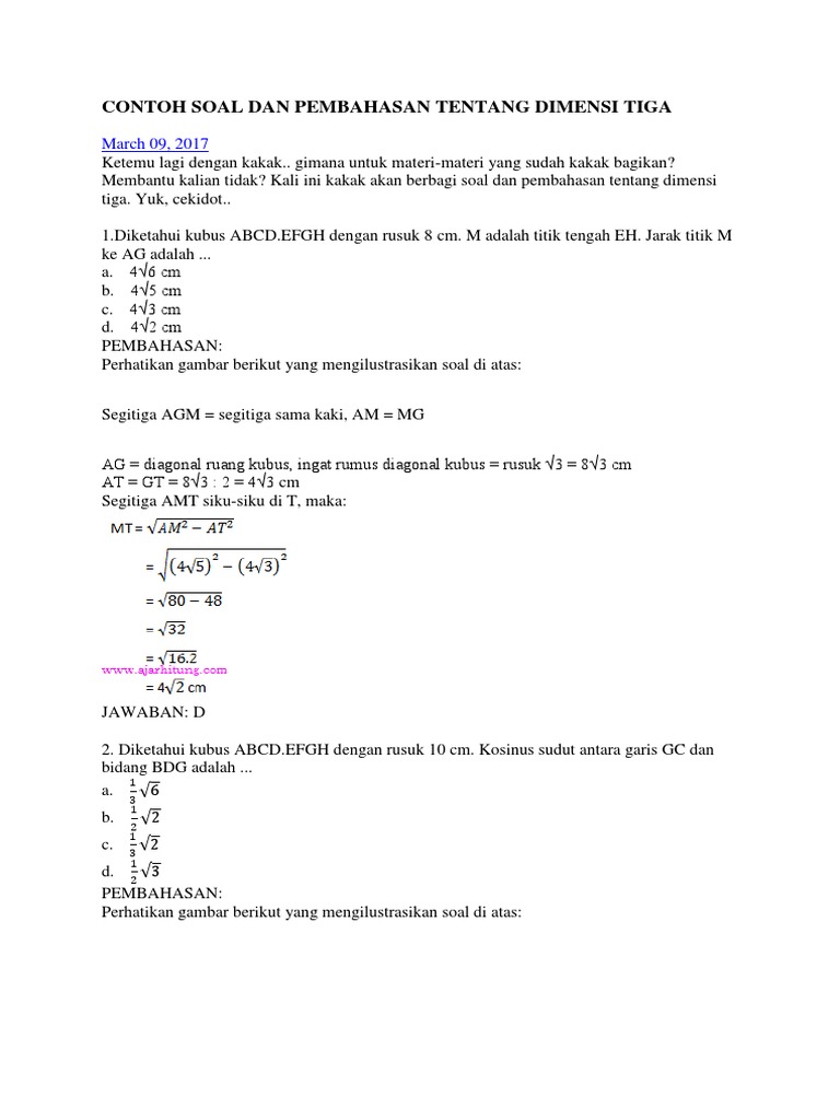 Kumpulan soal ulangan barisan deret dan notasi sigma beserta pembahasannya. Oke langsung saja kita ke pembahasannya. 1 kubus dengan panjang sisi 12 cm. Soal dan pembahasan materi dimensi tiga author by jagomatematika posted on october 7 2017 pada pembahasan kali ini akan dibahas beberapa soal ujian nasional bidang study matematika tentang dimensi tiga atau bangun ruang. Tentukan a panjang diagonal bidang sisi kubus. Setiap pembahasan materi jarak pada dimensi tiga akan dilengkapi dengan contoh soal dan pembahasannya.