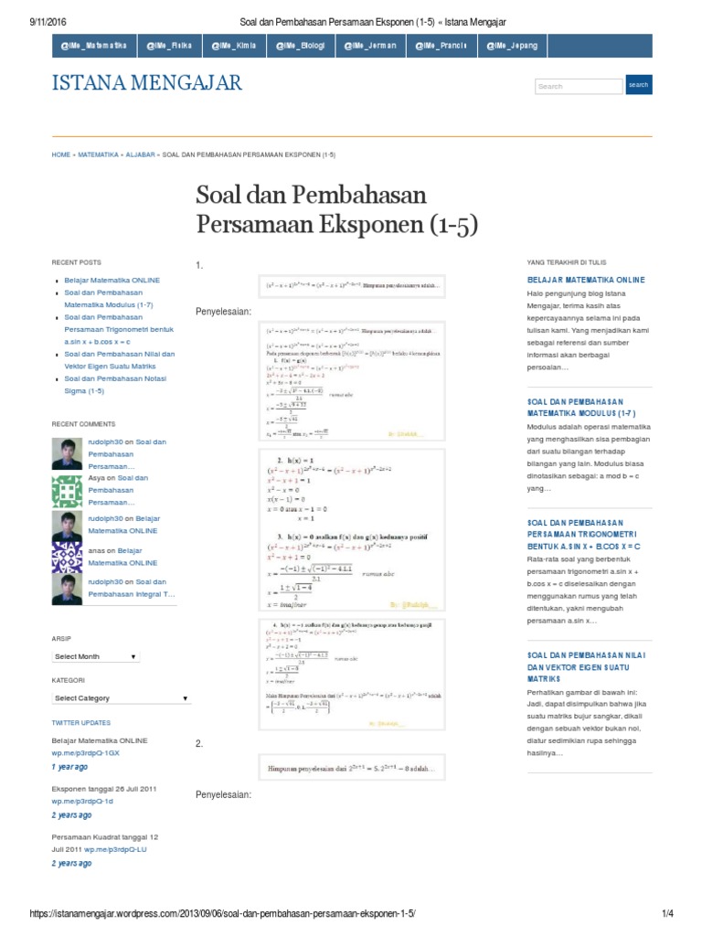 Contoh soal dan pembahasan tentang eksponen sma contoh soal dan pembahasan tentang sifat eksponen sma contoh soal dan pembahasan tentang pertidaksamaan eksponen sma contoh soal dan pembahasan tentang persamaan eksponen sma. Sebelum berbicara tentang persamaan dan pertidaksamaan eksponen sebaiknya kuasai terlebih dahulu sifat sifat dan rumus rumus eksponen. 35x 1 27x3 0 35x 1 33x3 35x 1 33x9 5x 1 3x 9 2x 10 x 5 contoh 7 soal.