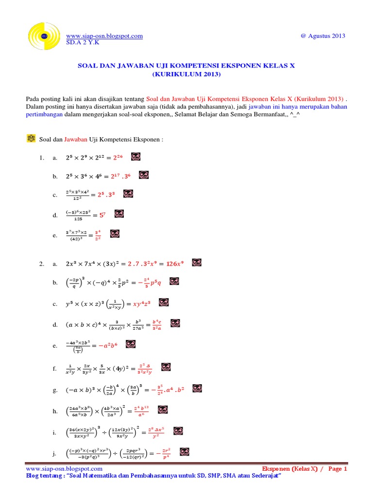 Soal matematika kelas 10 materi eksponen dan pembahasannya kurikulum 2013 ini merupakan contoh soal terbaru yang akan saya bagikan bagi bapakibu yang mengampu mata pelajaran matematika kelas 10 smama yang telah menerapkan kurikulum 2013. Selamat hari raya idul fitri mohon maaf lahir dan batin. Contoh soal dan pembahasan tentang eksponen sma contoh soal dan pembahasan tentang sifat eksponen sma. Untuk lebih jelasnya simak contoh soal berikut ini. Tentukan penyelesaian dari 3 2x 2 5 x 1 jawab. 35x 1 27x3 0 35x 1 33x3 35x 1 33x9 5x 1 3x 9 2x 10 x 5 contoh 7 soal.