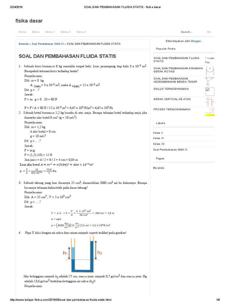 Contoh soal fisika fluida statis dan penyelesaiannya. November 20 2017 admin leave a comment. Soal dan pembahasan fluida dinamis. Sebuah jarum terapung di atas air. Soal dan pembahasan fluida statis sub bab. Dua pipa sempit diameter 30 mm dan 60 mm yang bergabung bersama untuk membentuk pipa u terbuka di kedua ujungnyajika pipa u berisi air apa perbedaan ketinggian dalam dua kolom pipa. Itulah yang dapat kami bagikan terkait contoh soal fisika fluida statis dan penyelesaiannya.
