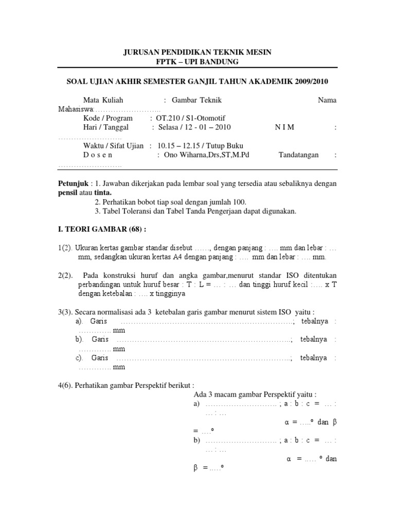 Contoh soal gambar teknik. Soal gambar teknik otomotif kelas 10 ini diperuntukkan bagi adik adik yang hendak mengikuti persiapan ujian semester ganjilgasal atau sebagai bahan latihan dan bahan ajar bagi guru mapel produktif teknik bisnis dan sepeda motor. Soal uas pekerjaan dasar to. Soal gbt gambar teknik x tmo. Soal berupa 40 pilihan ganda dan 5 soal uraian atau esai. Kita akan membahas soal dan jawaban gambar teknik. Berikut ini adalah 20 contoh soal pilihan ganda gambar teknik otomotif jurusan teknik sepeda motor semoga bermanfaat.