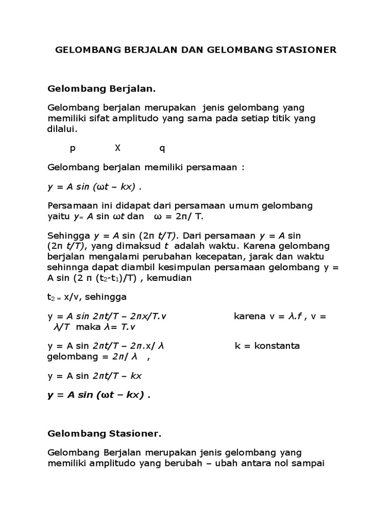 Simak paragraf demi paragraf berikut. Gelombang tali yang ketika gelombang datang berinteferensi dengan gelombang pantul pada tali. Beberapa murid yang saya ajar kadang masih bingung mengerjakan soal soal tentang gelombang berjalan tersebut. Contoh soal 1 suatu gelombang yang frekuensinya 500 hz merambat dengan kecepatan 300 ms. Besar amplitudo gelombang stasioner akan berubah ubah di antara nilai maksimum dan nilai minimumnya. Contoh soal gelombang berjalan dan stasioner beserta jawaban gelombang berjalan merupakan jenis gelombang yang memiliki sifat amplitudo yang sama pada setiap titik yang dilaluigelombang stasioner yaitu sebuah gelombang yang memiliki amplitudo yang berubah ubah antara nol sampai nilai maksimum tertentu.