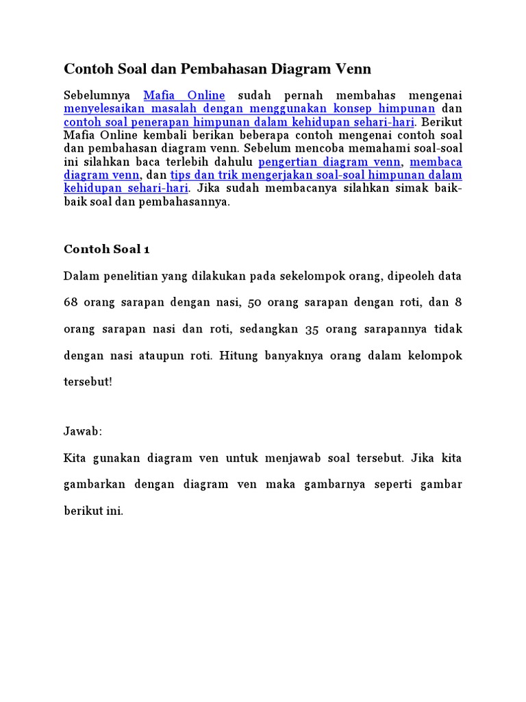 Untuk contoh soal himpunan diagram venn sd smp sma smk. Demikian postingan mafia online tentang contoh soal dan cara menjawab himpunan atau diagram venn. Kumpulan contoh soal himpunan matematika dan pembahasannya beserta penyelesaian jawabannya. Sebelum mencoba memahami soal soal ini silahkan baca terlebih dahulu pengertian diagram venn membaca diagram venn. Postingan ini membahas contoh soal diagram venn dan pembahasannya atau penyelesaiannya. Jika ada masalah terkait pembahaasan di atas silahkan ditanyakan di kolom komentar.