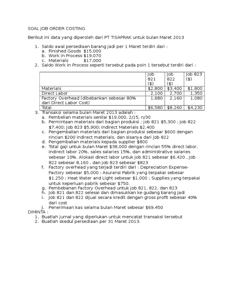 Contoh soal job order costing. Contoh job order costing. Sunday 31 march 2019. Memiliki persediaan berikut ini per tanggal 1. Contoh soal 2 job order costing beserta jawabannya san sunday march 31 2019 3 comments. Berikut ini adalah kumpulan berkas file guru tentang contoh soal job order costing yang bisa anda unduh secara gratis dengan menekan tombol download. Pt merdeka manufakturing memproduksi mesin yang didasarkan pada pesanan dan spesifikasi ditentukan konsumen.