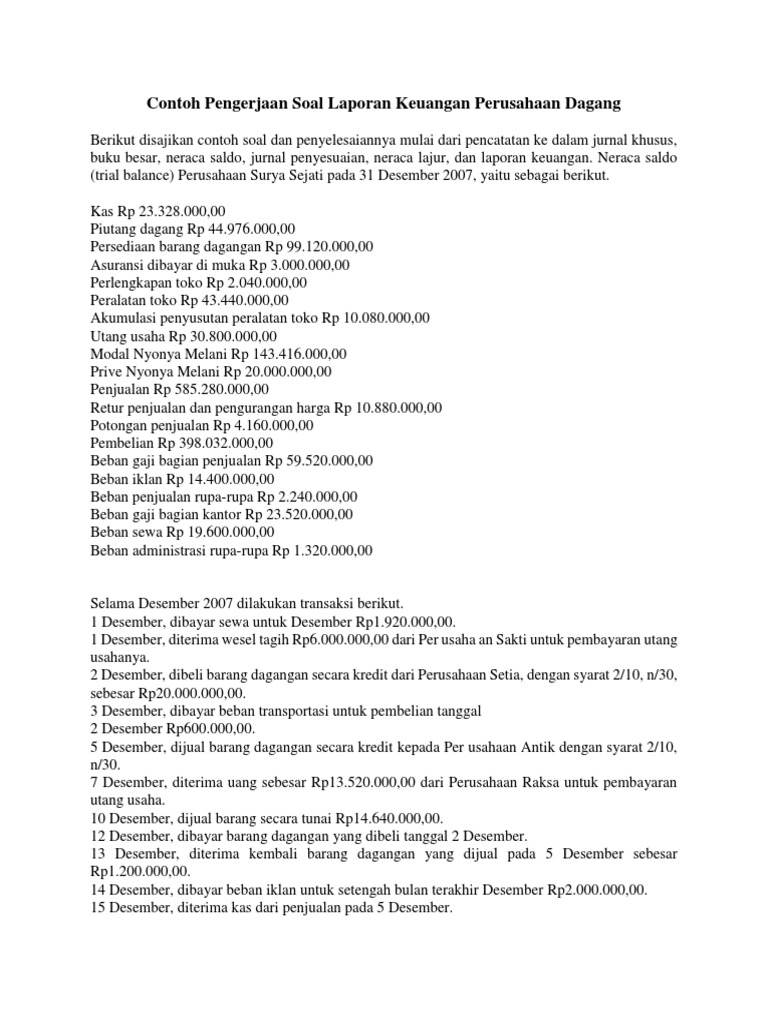 Neraca saldo trial balance perusahaan surya sejati pada 31 desember 2007 yaitu sebagai berikut. Berikut merupakan contoh soal cara membuat jurnal umum buku besar neraca saldo laba rugi laporan perubahan modal neraca keuangan dan laporan arus kas di lengkapi dengan transaksi transaksi yang terjadi diperusahaan. Ada juga contoh laporan keuangan dalam versi bahasa inggris. Bagi perusahaan baik perusahaan dagang maupun jasa menyusun laporan keuangan adalah salah satu rutinitas yang harus dilakukan untuk memperoleh gambaran informasi. Contoh laporan keuangan perusahaan dagang perusahaan jasa dan perusahaan manufaktur ini akan sangat membantu sebagai referensi usaha dan bisnis anda. Berikut disajikan contoh soal dan penyelesaiannya mulai dari pencatatan ke dalam jurnal khusus buku besar neraca saldo jurnal penyesuaian neraca lajur dan laporan keuangan.
