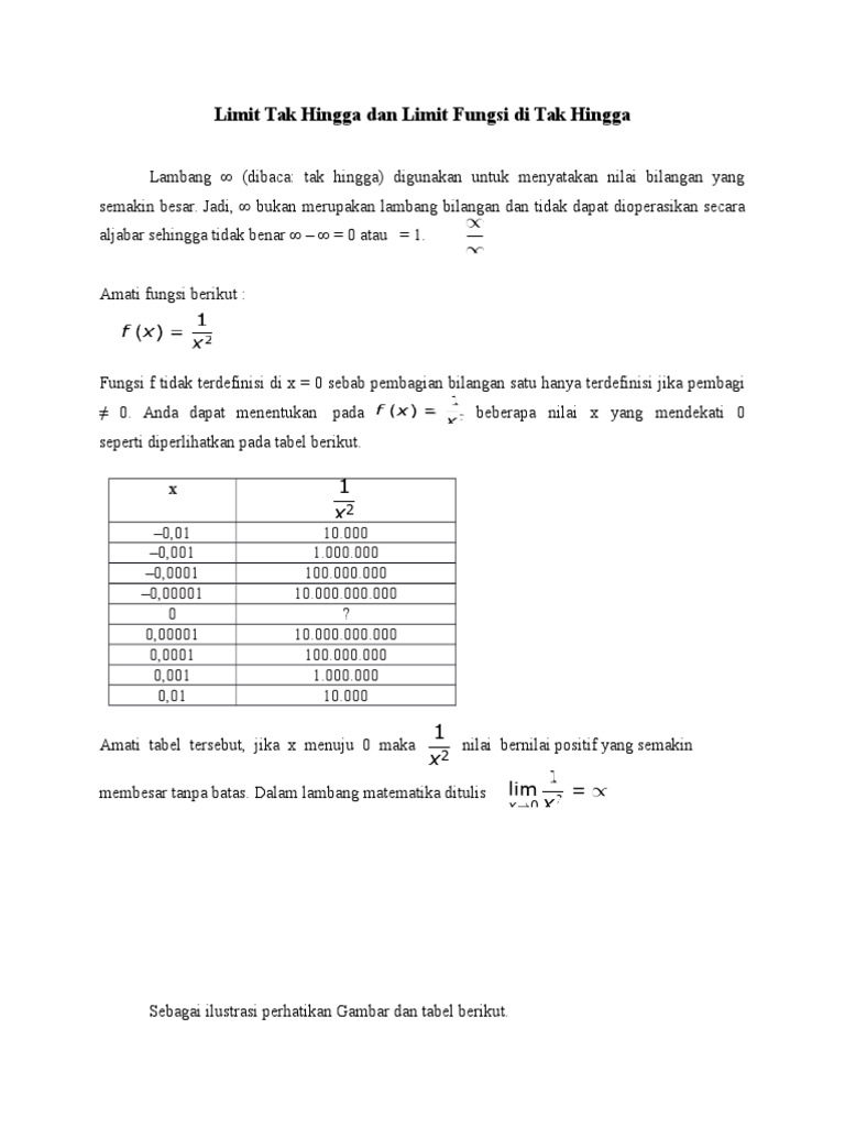 Dalam pengoprasian limit fungsi aljabar terkadang juga terdapa nilai x yang mendekati tak berhingga. Limit didalam konsep ilmu matematik biasa digunakan untuk menjelaskan suatu sifat dari suatu fungsi saat agumen telah mendekati pada suatu titik tak terhingga atau sifat dari suatu barisan saat indeks mendekati tak hingga. Saya juga berencana untuk membuat artikel tersendiri yang berkaitan dengan limit tak hingga fungsi trigonometri karena soal bentuk ini keluar pada sbmptn 2017 matematika ipa. Dari buku buku pelajaran yang ada ternyata ada beberapa. Soal soal tersebut diambil dari berbagai sumber referensi termasuk dari soal ujian nasional soal sbmptn dan soal tingkat olimpiade. Bentuk tak tentu pada limit fungsi pecahan.