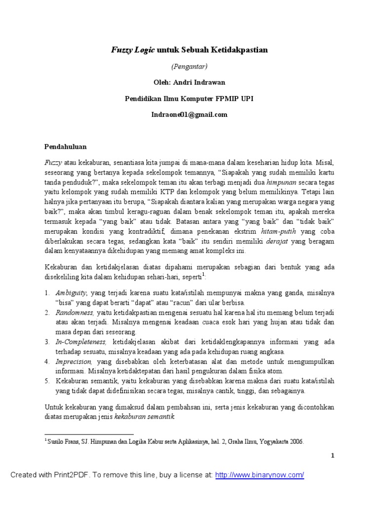 Logika fuzzy 771 pendahuluanorang yang belum pernah mengenal logika fuzzy pasti akan mengira bahwalogika fuzzy adalah sesuatu yang amat rumit dan tidak menyenangkan. Operasi logika himpunan fuzzy operasi himpunan fuzzy diperlukan untuk proses inferensi atau penalaran. Logika fuzzy dikembangkan berdasarkan bahasa manusia bahasa alami. Menyusun konsep sistem kontrol dengan logika fuzzy. Academiaedu is a platform for academics to share research papers. Unknown senin 16 juni 2014 pada postingan kali ini saya akan share cara menyelesaikan sebuah permasalahan produksi menggunakan metode tsukamoto pada bab fuzzy logic.