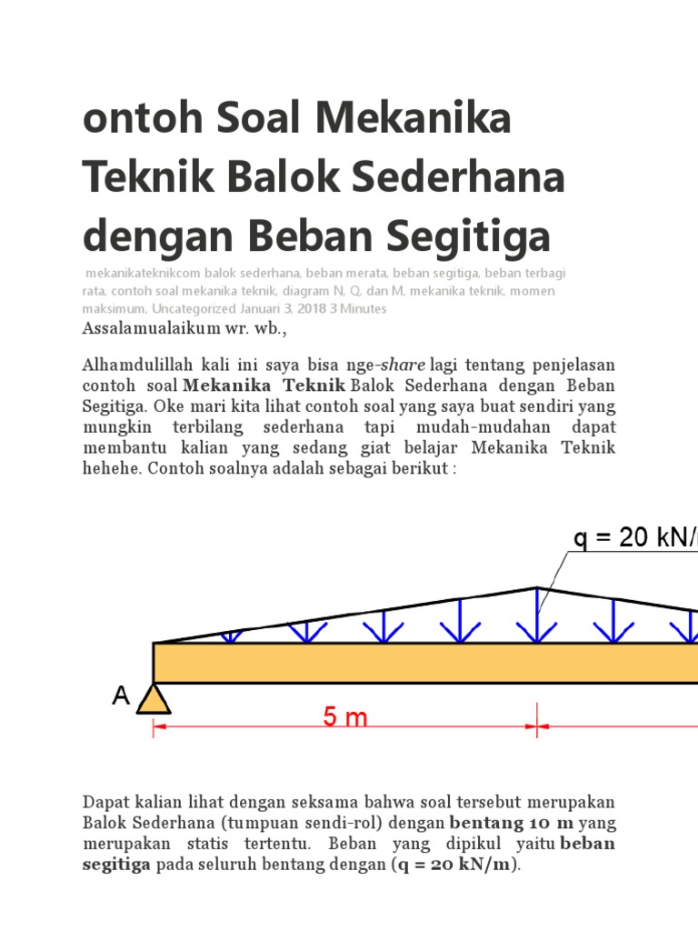 Besar gaya beban merata dihitung dengan cara mencari luasan beban merata yang bekerja pada titik berat jenis beban merata. Contoh soal mekanika teknik balok sederhana dengan beban segitiga.