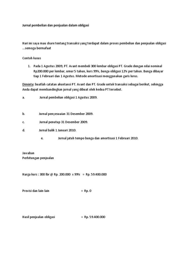 Contoh soal obligasi pengantar akuntansi 2. Contoh soal ujian soal ini telah saya ujikan di kelas saya. Latihan soal dan jawaban akuntansi pengantar 2 pt danamon tanggal 1 mei 2010 menerbitkan obligasi berjangka waktu 7 tahun kepada pt dinamika dengan nilai nominal rp 19000000000 dan bunga 12 untuk mendanai kegiatan operasi dalam menghasilkan dan menjual peralatan elektronik. Perhatikan contoh investasi obligasi berikut ini. Tanggal 1 agustus 2000dibeli 10 lembar obligasi pt. Latihantugas untuk topik obligasi. Pada tanggal 1 april 2015 pt manajemen keuangan network membeli obligasi dengan nominal rp 1000000 dan bunga 12.