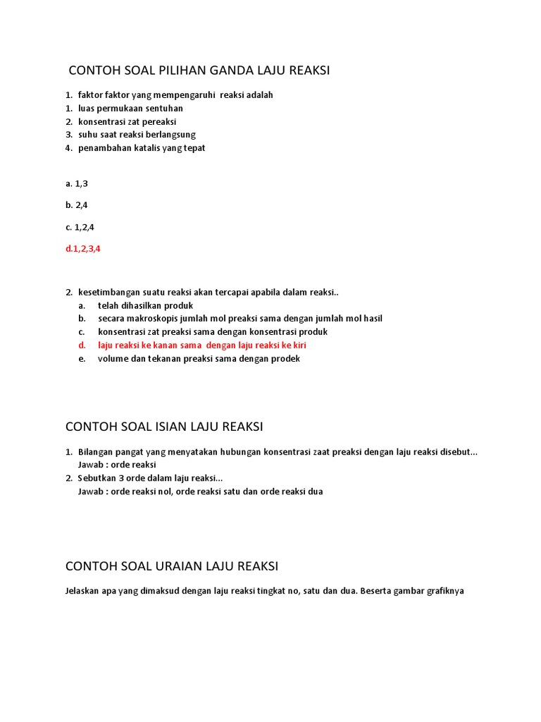 Orde reaksi adalah bilangan pangkat yang menyatakan hubungan konsentrasi zat pereaksi dengan laju reaksi. 2hgci 2 aq c 2 o 4 2 aq 2co 2 g hg 2 ci 2 s 2ci aq diketahui dengan mengukur jumlah mol hg 2 ci 2 yang mengendap per liter per menit dan diperoleh data diperoleh data sebagai berikut. Vkp p q q untuk mencari orde p pilih konsentrasi q sama. Disini pakdosen membahas secara rinci tentang pengertian rumus persamaan faktor orde dan contoh soalsimak penjelasan berikut secara seksama jangan sampai ketinggalan. Berikut ini beberapa contoh soal dan pembahasan mengenai materi laju reaksi semoga dapat bermanfaat dan menambah pengetahuan adik adik semua selamat belajar. Mungkin anda pernah mendengar kata laju reaksi.
