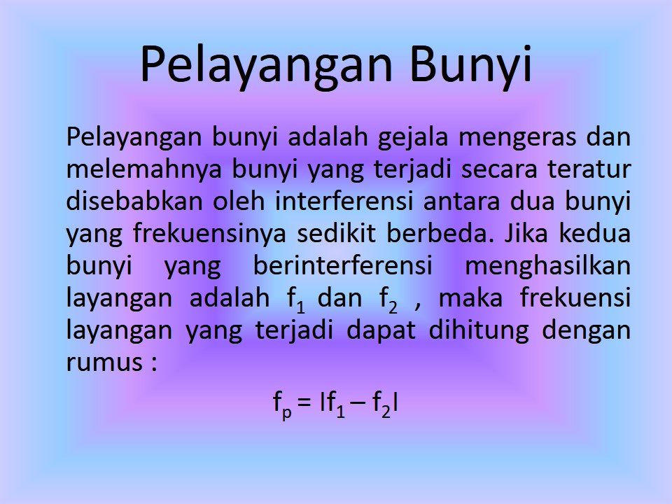 Blog ini merupakan tugas akhir mata kuliah multimedia pembelajaran fisika. Layangan bunyi atau pelayangan bunyi adalah terjadinya pengerasan bunyi dan pelemahan bunyi tersebut adalah efek dari interferensi gelombang bunyi. Sebuah garpu tala dibunyikan di atas kolomudara yang dimasukan ke dalam air. Blog ini dilengkapi animasi simulasi dan video untuk mempermudah siswa dalam belajar. Sebuah sirine pada mobil pemadam kebakaran dengan frekuensi 2000 hz mendekati seseorang yang memancarkan bunyi dengan frekuensi yang samabergerak mendekati mobil pemadam kebakaaran. Pelayangan akan terjadi jika dua sumber bunyi menghasilkan frekuensi gelombang yang mempunyai beda frekuensi yang kecil.