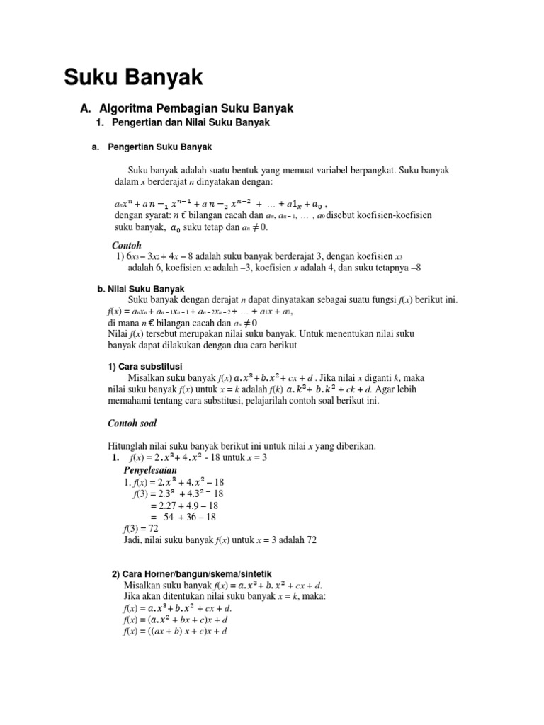 1 diberikan suku banyak fx 3x 3 2x 10. Posted in matematika tagged aljabar suku banyak contoh soal pembagian suku banyak dengan cara bersusun menentukan akar akar rasional dari persamaan suku banyak pembagian suku banyak dengan ax2bxc rumus suku banyak soal dan pembahasan suku banyak pdf soal dan pembahasan suku banyak word soal sbmptn suku banyak. Tentukan hasil bagi 4 x 5 3 x 3 6 x 2 5x1 bila dibagi dengan 2x 1 menggunakan metode pembagian bersusun dan metode horner. Jika ada bagian yang kurang jelas atau ada bagian yang tidak teliti bisa kasih komentar di kolom komentar di bawah. Berikut ini materi lengkap tentang suku banyak mulai dari materi dasar nilai pembagian akar akar teorema sisa teorema faktor hingga contoh soal. Contoh soal pembagian suku banyak 1.