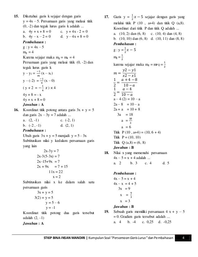 Contoh soal persamaan garis lurus dan jawabannya. Simak kumpulan soal un dengan materi persamaan garis lurus pada pembahasan di bawah. Persamaan garis lurus dalam pembahasan kali ini kita akan mencoba belajar memahami rumus persamaan garis lurus dan gradien serta mengerjakan beberapa contoh soal seputar gradien agar kita bisa dengan cepat mengerti materi matematika kali ini. Contoh soal garis dan sudut matematika smp hola sobat idschool pada halaman ini idschool akan mengupas tentang contoh soal garis dan sudut. Persamaan garis lurus bentuk umum y mx persamaan yang melalui titik pusat 0 0 dan bergradien m. Seperti kisi kisi yang telah dikeluarkan bsnp materi garis dan sudut akan kembali muncul di ujian nasional tahun 2020. Contoh soal ini disusun dalam bentuk pilihan berganda dilengkapi dengan pembahasan dan dirancang sedemikian rupa berdasarkan subtopik yang paling sering keluar dalam kajian persamaan grais lurus untuk tingkat mengengah pertama seperti mencari gradien melalui titik menentukan gradien berdasarkan grafik menentukan gradien berdasarkan persamaan garis menyusun persamaan garis lurus melalui.