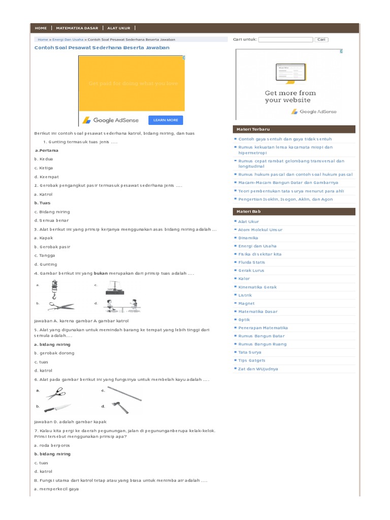 10 soal essay pesawat sederhana beserta jawabannya. Berikut ini contoh soal pesawat sederhana katrol bidang miring dan tuas gunting termasuk tuas jenis. Admin dari blog contoh soal terbaru 2019 juga mengumpulkan gambar gambar lainnya terkait contoh soal relasi dan fungsi kelas 8 beserta jawabannya dibawah ini. Gerobak pengangkut pasir termasuk pesawat sederhana jenis. Penggunaan pesawat sederhana dalam bekerja menjadikan gaya yang diberikan pada benda menjadi lebih kecil. Perhatikan gambar tentukan.