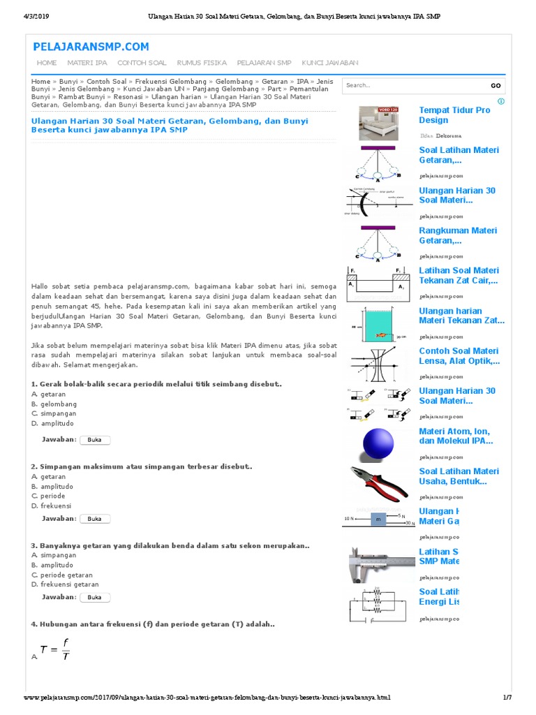 Latihan soal getaran gelombang dan bunyi beserta jawabannya berikut ini beberapa latihan soal materi getaran gelombang dan bunyi yang bisa adik adik pelajari untuk persiapan menghadapi penialaian akhir semester pas ipa kelas 8 semester genap. Gejala getaran banyak ditemukan dalam kehidupan sehari hari. Demikian materi fisika. Getaran gelombang bunyi materi pembelajaran fisika kali ini akan membahas latihan soal getaran gelombang dan bunyi. Getaran dan gelombang beserta contoh soal dan pembahasannya yang dapat kami sampaikan. Contoh soal materi getaran dan gelombang beserta kunci jawabannya.