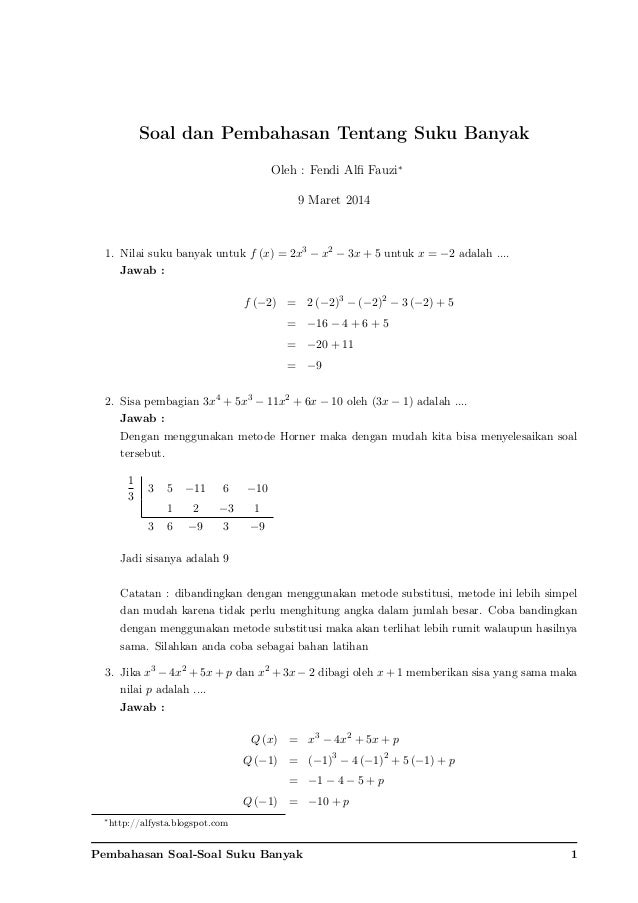 Operasi yang dipakai hanya penjumlahan pengurangan perkalian serta pangkat bilangan bulat tidak negatif. Perlu kalian tahu bahwa bank bank soal quipper selalu up to date untuk soal soal un dan snmptn. Polinomial atau yang biasa disebut juga sebagai suku banyak adalah sebuah bentuk dari suku suku dengan nilai banyak yang disusun dari perubah variabel serta konstanta. Inilah pembahasan lengkap terkait contoh soal komunikasi keperawatan beserta jawabannya. Contoh soal himpunan dan penyelesaiannya beserta jawabannya by azzahra rahmah posted on january 9 2020 rumuscoid pada kesempatan kali ini kita akan membahas mengenai contoh soal tentang himpunan dan pada kesempatan sebelumnya kita juga telah membahas tentang contoh soal aljabar nah untuk saat ini materi lengkap tentang contoh soal mengenai aljabar. Fx 2x 3 3x 2 x 5.