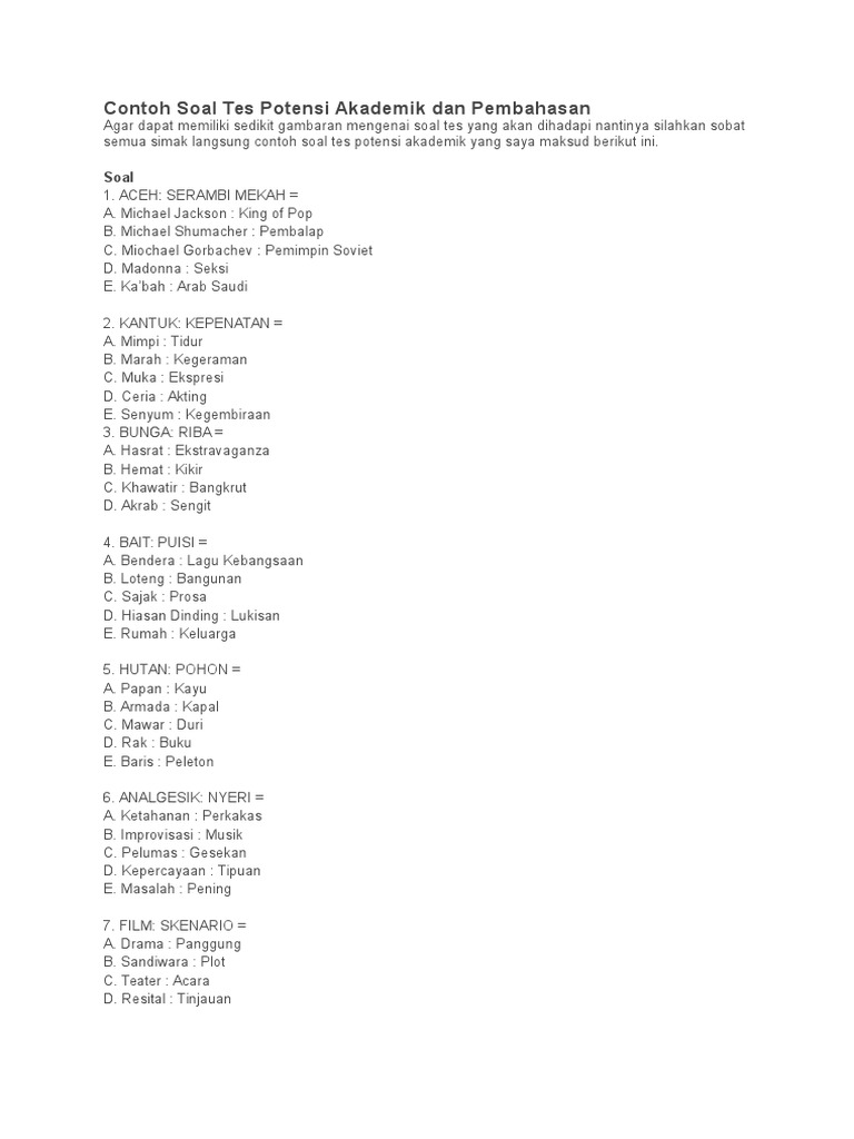 Contoh soal potensi akademik. Contoh soal tes potensi akademik tpa terbaru. Latihan soal tes potensi akademik tpa kode soal. Sobat bisa mencoba menjawab terlebih dahulu soal tersebut baru mencocokkan dengan jawaban dari kami. Soal tes potensi akademik logika. Pada artikel sebelumnya sudah dibahas tentang latihan soal pretest 100 kunci jawaban ppg 2019. Carilah padanan kata sinonim yang tepat dari kata berikut ini 1.