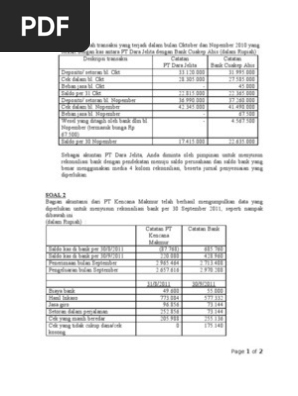 Soal rekonsiliasi bank beserta jawabannya ini akan menjelaskan contoh soal rekonsiliasi bank dan cara penyelesaiannya soal rekonsiliasi bank dan pembahasannya soal rekonsiliasi bank dan jurnal penyesuaian soal rekonsiliasi bank berikut ini adalah contoh kasus rekonsiliasi bank dan penyelesaiannya. Sebagai ilustrasi sederhana pt apes pada 30 juli memperlihatkan saldo kas sebesar rp 7600 di pembukuannya. Laporan bank mewujudkan bahwa pada tanggal 31 januari 2014 nilai sisa bank dari perusahaan. Contoh soal dan metode pencatatan kas kecil. Soal uas rekonsiliasi bank. Bima yang menunjukan saldo sebesar rp1550000.