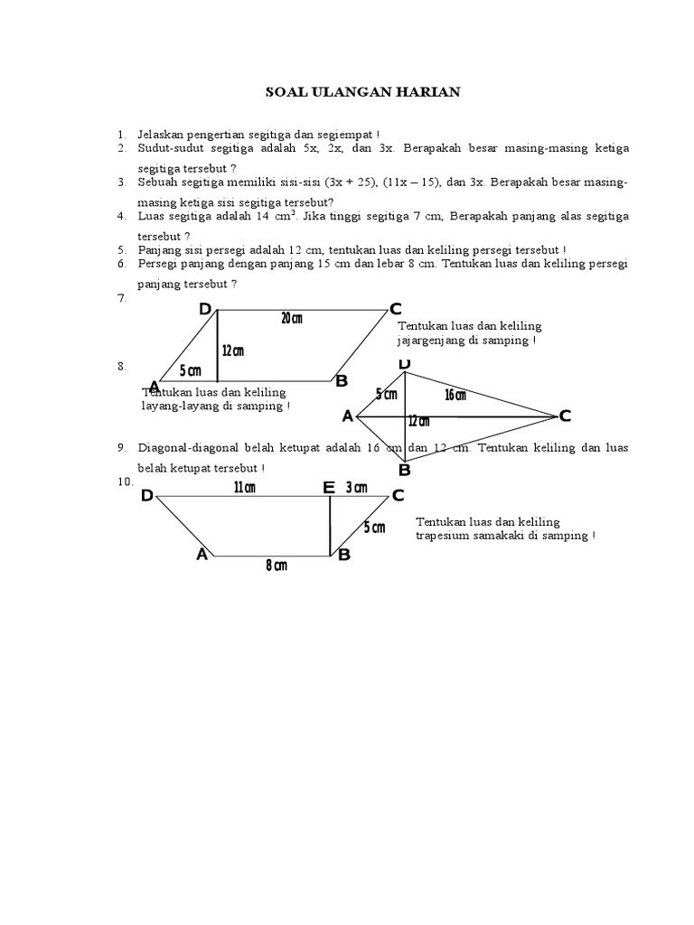 Simak kumpulan soal un dengan materi segiempat dan segitiga pada pembahasan di bawah. Semoga bermanfaat dan persiapkan ujian mulai dari sekarang dengan mengerjakan latihan soal un smp segitiga dan segiempat dan contoh soal segitiga dan segiempat serta jawabannya kelas 7. Seperti kisi kisi yang telah dikeluarkan bsnp materi segitiga dan segi empat akan kembali muncul di ujian nasional tahun 2020. Soal un matematika smpmts tahun 2019. Pak burhan membuat taman berbentuk persegi panjang berukuran 5 m 4 m. Soal uh mtk smp kelas 7 bab segitiga dan segi empatpdf.