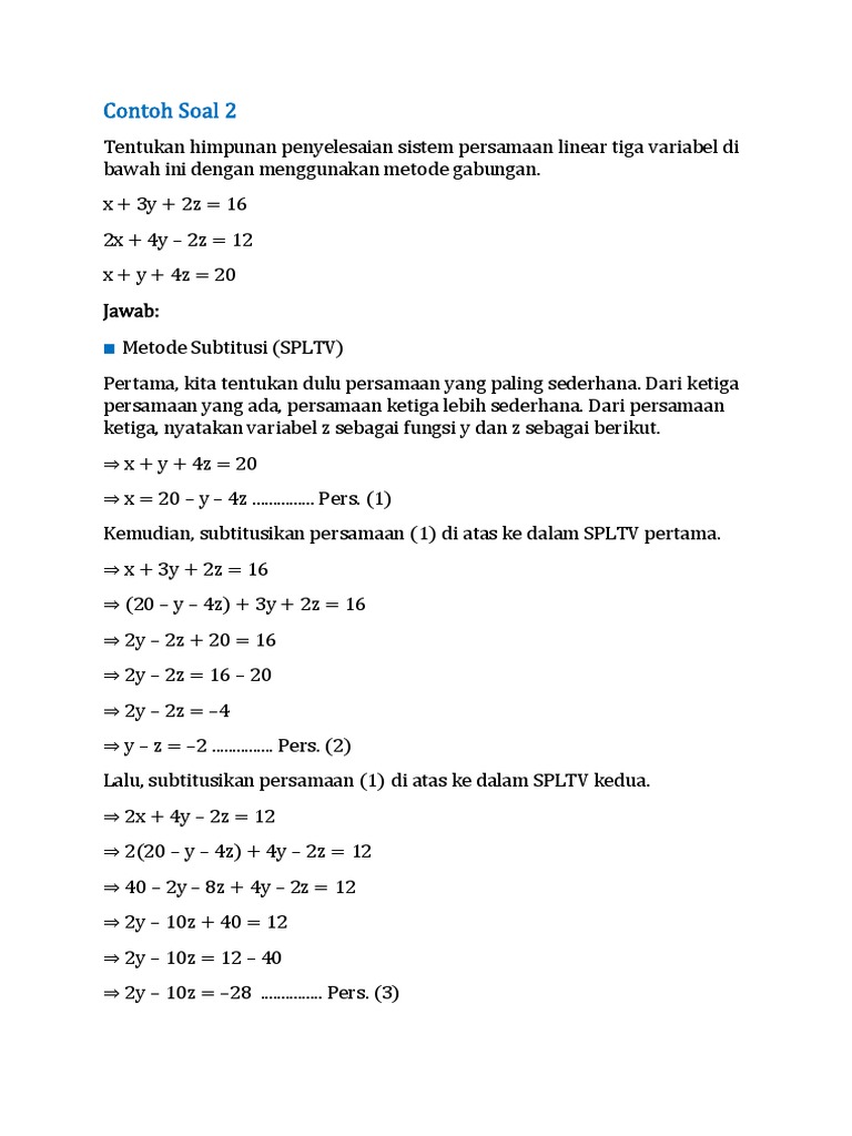 Untuk lebih memahami tentang sistem persamaan linear tiga variable berikut kami sajikan beberpa contoh soal spltv beserta jawaban dan pembahasannya. Soal dan pembahasan super lengkap sistem persamaan linear tiga variabel spltv sistem persamaan linear tiga variabel spltv merupakan salah satu materi matematika wajib peminatan yang dipelajari saat tingkat sma tepatnya di kelas x. Nah agar kalian lebih memahami dan terampil dalam memecahkan masalah yang berkaitan dengan merancang model matematika berbentuk sistem persamaan linier 3 variabel spltv silahkan kalian pelajari beberapa contoh soal cerita dan pembahasannya berikut ini. Soal dan pembahasan matematika modulus 1 7 modulus adalah operasi matematika yang menghasilkan sisa pembagian dari suatu bilangan terhadap bilangan yang lain. A mod b c yang soal dan pembahasan persamaan trigonometri bentuk asin x bcos x c. Jadi bentuk persamaan nya adalah 5x 16y 20z.