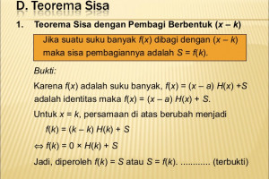 Jadi sisa pembagian hx oleh x² 2x 3 adalah 33x 39. Sesuai dengan judulnya yaitu teorema sisa dan teorema faktor pada suku banyak maka kita akan lebih memfokuskan pada sisa pembagian dan faktor pada suku banyaknya. Dua teorema yang tidak boleh ditinggalkan untuk dipelajari pada materi suku banyak polinomial adalah teorema sisa dan teorema faktor. Sebenarnya sisa pembagian suatu suku banyak sudah kita bahas pada artikel operasi pembagian suku banyak dimana untuk menentukan sisanya bisa menggunakan dua cara yaitu cara bersusun dan cara skema horner. Di sini kamu akan belajar tentang teorema sisa melalui video yang dibawakan oleh bapak anton wardaya. Perhatikan contoh contoh soal suku banyak berikut ini.