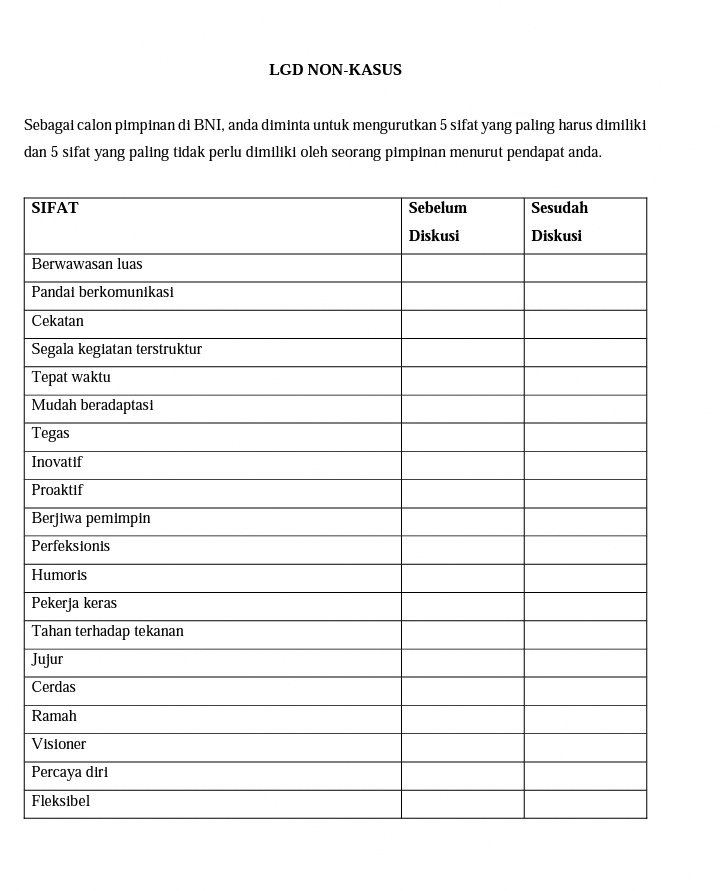 Lgd merupakan sarana diskusi dalam seleksi bidang akademis. Lihat latihan soal dibawah latihan soal leaderless group discussion mari kita tes kemampuan kalian di bagian leaderless group discussion lanjut ke latihan soal. Tips dan trik menghadapi focus group discussion fgd 100 lolos. By mas min posted on december 9 2016. Uu minerba issue jakarta international school relokasi ke bandara halim perdana kusuma dan juga soal pangan. Tes materi terdiri dari lebih dari 50 soal pilihan ganda atau lebih kalau gsalah inget ya isinya campur antara materi perbankanakuntansimakro mikro ekonomi plus masalah masalah terkini.