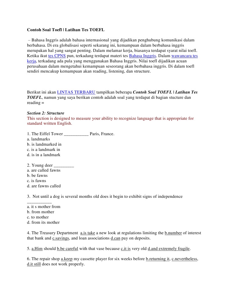 Setelah mengerjakan soal ini diharapkan kamu dapat memperoleh gambaran kemampuan bahasa. Demikian 10 contoh soal structure dalam tes toefl ya sahabt ibi. Pengertian cause connector dan contoh kalimatnya dalam bahasa inggris. Latihan soal tes toefl online gratis ini berjumlah 20 s oal. Soal disusun menyerupai standar soal toefl ada soal listening structure dan reaading. Dear reader hari ini saya akan mengulas tentang contoh soal toefl.