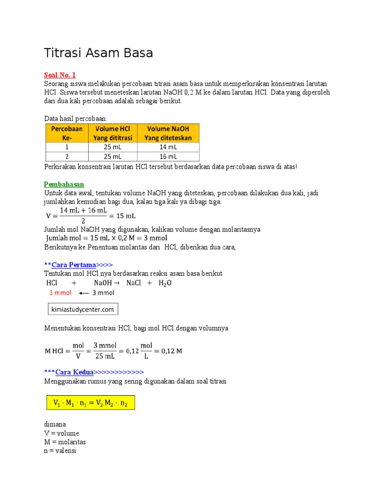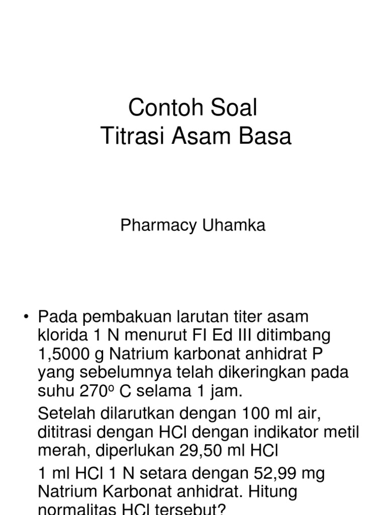 Titrasi asam kuat dengan basa kuat. Inilah beberapa contoh soal dan jawaban tentang titrasi asam basa. Contoh soal dan pembahasan asam basa dan titrasi.