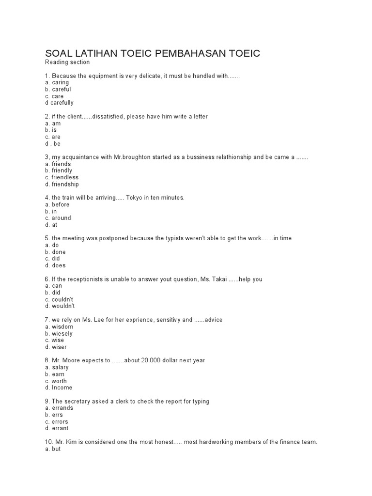 Contoh soal toeic dan pembahasannya pdf. Contoh contoh pertanyaan toeic contoh soal disadur dari toeic examinee handbook educational testing service. Care d carefully 2. Jika kalian akan mengikuti test toefl dalam waktu dekat ini maka tidak salah jika kalian membaca artikel ini sampai tuntas sebagai bahan referensi kalian karena saya akan memberikan 50 contoh soal toefl reading comprehension lengkap dengan kunci jawaban dan pembahasan. Dear reader hari ini saya akan mengulas tentang contoh soal toefl. Contoh soal toeic grammar dan jawaban free download as word doc doc pdf file pdf text file txt or read online for free. The best toeic and smk listening test materials to download.