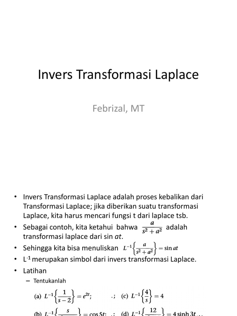 Contoh soal transformasi laplace dan penyelesaiannya. Transformasi z transformsi z langsung sifat sifat transformasi z transformasi z rasional transformasi z balik transformasi z satu sisi. Transformasi laplace sifat sifat transformasi laplace sifat sifat transformasi laplace sifat sifat transformasi laplace pecahan parsial xs derajat ps derajat qs pecahan parsial xs akar akar qs berbeda tidak ada yang sama pecahan parsial xs jika pi pk maka penyelesaian dapat diselesaikan secara khusus yang menghasilkan xt merupakan fungsi cosinus dan sinus pecahan parsial x. Tentukanlah transformasi lapalce invers. Konvergen ae roc 4 contoh dan soal soal latihan tentukan transformasi z dari sinyal berhingga waktu diskrit berikut serta. Soal latihan transformasi laplace dan transformasi z 2010 2011 pdf praktikum sinyal dan sistem pdf comparative study of methods lecture oriented student oriented advertisement. Pada kesempatan ini id ku akan memposting soal dan pembahasan rotasi perputaran dengan matriks dimana rotasi perputaran ini sendiri merupakan bagian dari materi transformasi geometri.