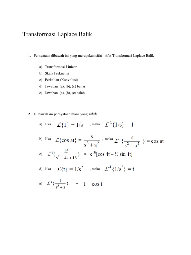 Contoh soal transformasi laplace. Jadi transformasi laplace untuk turunan dari fx diberikan dalam bentuk transformasi laplace dari fx itu sendiri dan nilai dari fx untuk x 0. Suatu kelebihan metode transformasi lapalace adalah bahwa metode ini memungkinkan penggunaan teknik grafis untuk meramal kinerja sistem tanpa menyelesaikan persamaan diferensial sistem. 11 deret fourier 1 9 contoh soal transformasi lapace 5 8 transformasi laplace 5 7 transformasi lapalce 4 tabel transformasi lap. Sebelum anda menggunakan fakta ini perhatikanlah dua sifat transformasi laplace dalam frame berikut. 8 8 mendukung tandai dokumen ini sebagai bermanfaat 0 0 menolak tandai dokumen ini sebagai tidak bermanfaat tanamkan. Tentukanlah transformasi lapalce invers.
