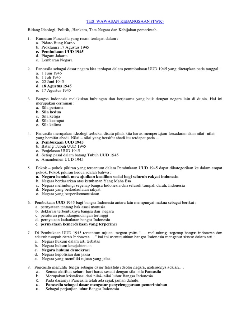 Demikian informasi tentang contoh soal dan kunci jawaban twk tes wawasan kebangsaan cpns 2018 2019 pdf. Contoh soal skd cpns 2020 twk tiu dan tkp jawabanya saat ini pencarian contoh soal cpns 2020 pdf atau dalam bentuk lainnya banyak dicari. Kontribusi anda dalam berkomentar dan berbagi sangat bermanfaat bagi kemajuan web ini dan pengunjung. Ingat soal soal ini hanya sebatas soal latihan yang diharapkan menambawah wawasan pengetahuan kita tentang materi kebangsaan intelegensi dan kepribadian. Oleh sebab itu kali ini saya akan kembali membagikan contoh contoh soal tes wawasan kebangsaan twk untuk menambah refernsi teman teman. Berikut kumpulan contoh soal cpns twk tes wawasan kebangsaan untuk menilai peserta cpns dalam penguasaan pengetahuan dan kemampuan dalam mengimplementasikan nilai nilai 4 empat pilar kebangsaan indonesia.