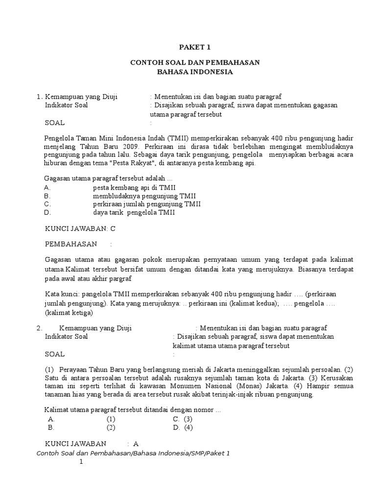 Contoh soal un bahasa indonesia smp. Soal bahasa indonesia kelas 9 by guru saputra posted on december 24 2019 december 24 2019 artikel materi soal bahasa indonesia kelas 9 tahun 2020 2021 smpmts lengkap pg dan essay kurikulum 2020 pelajaran bahasa indonesia untuk semester 1 dan 2. Soal bahasa indonesia kelas 9 by azzahra rahmah posted on january 24 2020 march 31 2020 rumuscoid pada kesempatan kali ini kita akan membahas makalah materi tentang soal bahasa indonesia kelas 9 semester 1 dan 2 lengkap dengan jawabannya langsung yang mana pada pembahasan sebelumnya kita sudah membahas materi tentang soal bahasa indonesia kelas 8 berikut jawabannya. Artikel ini berisi kumpulan latihan soal un smp bahasa indonesia tahun 2019 beserta pembahasannya supaya bisa menyelesaikan soal bahasa indonesia diperlukan beberapa aspek pengetahuan. Semoga soal soal tersebut menjadi bahan bagi adik adik yang sedang mencari referensi contoh contoh soal un unbkunkp smp mts tahun 2020. Ujian nasional tahun 2020 merupakan amanat dari undang undang nomor 20 tahun 2003 tentang sistem pendidikan nasional. Soal ujian nasional smpmts bahasa indonesia tahun 2015 download.