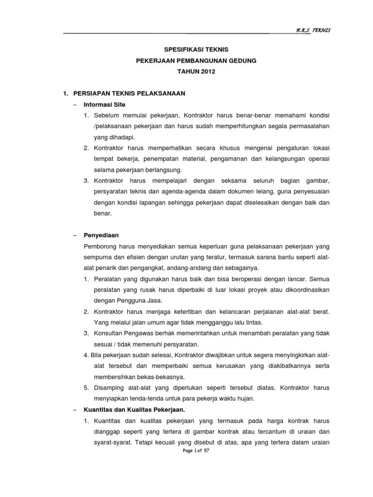 Mutu barang jasa m e n y u s u n s p e s i f i k a s i te k n i s uk 05. Spesifikasi umum 2018 ini disusun berdasarkan reviu spesifikasi umum 2010 revisi 3 pemutakhiran dan penyesuaian dilakukan dengan mempertimbangkan kondisi saat ini terkait dengan perkembangan teknologi bahan peralatan dan teknologi untuk pelaksanaan konstruksi pekerjaan jalan dan jembatan. Direktorat jenderal bina konstruksi. Bersama dengan gambar konstruksi spesifikasi merupakan bagian dari dokumen kontrak dan bertujuan membantu pelaksaan pekerjaan konstruksi agar sesuai dengan kualitas dan kinerja yang. Contoh pembuatan spesifikasi teknis pekerjaan konstruksi by hereisnvidia.