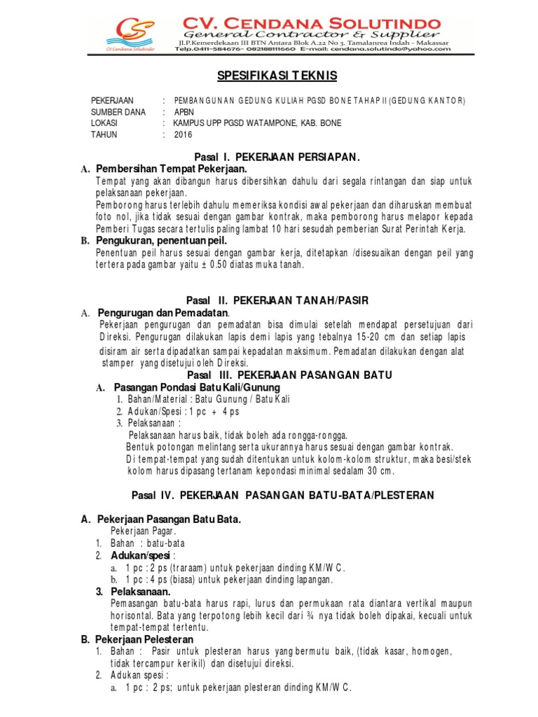 Contoh spesifikasi teknis pekerjaan konstruksi. Daftar personel memuat daftar personel yang ikut dalam pengawasan pelaksanaan pekerjaan konstruksi. Spesifikasi teknis pekerjaan sipil dan arsitektur. Untuk jasa konstruksi termasuk dalam mutu adalah metode pelaksanaan pekerjaan. Jumlah dan waktu jumlah barang kapan diserahkan dan. Spesifikasi teknis atau biasa disebut spesifikasi specifications adalah uraian secara terperinci tentang persyaratan atau kriteria kriteria atas barang dan jasa yang diperlukan untuk suatu pekerjaan konstruksi. Dalam pekerjaan konstruksi spesifikasi teknis merupakan suatu tatanan teknik yang dapat membantu semua pihak yang terkait dengan pekerjaan konstruksi untuk sependapat dalam pemahaman sesuatu hal teknis tertentu yang terjadi dalam suatu pekerjaan.