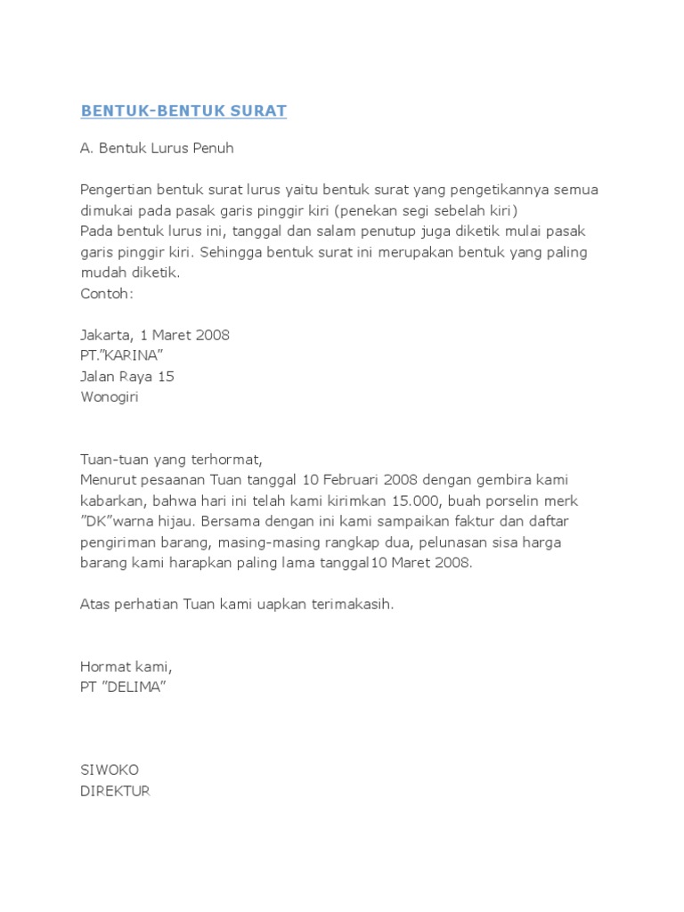 Contoh surat bentuk lurus. Contoh surat full block style bentuk surat ini disebut juga dengan surat bentuk lurus penuh. Untuk penulisan bagian bagian surat semuanya dimulai dari kiri. Surat bentuk lurus penuh full block style. Ukuran batas pinggir kiri 20 dan kanan 80 elite atau batas pinggir 15 dan kanan 75 pica. Salah satu bentuk surat yang juga sering digunakan adalah surat bentuk setengah lurus atau yang juga dikenal dengan surat bentuk semi block stylesurat bentuk setengah lurus yaitu bentuk surat yang pada intinya hampir sama dengan bentuk lurus perbedaannya terletak pada pengetikan isi saja yaitu setiap alenia baru masuk lima spasi. Dimana pada surat bentuk setengah lurus ini pengetikan alamat suratnya sama dengan bentuk surat lurus sedangkan pengetikan isi suratnya sama dengan bentuk surat lekuk yaitu setiap alinea masuk lima hentakan.