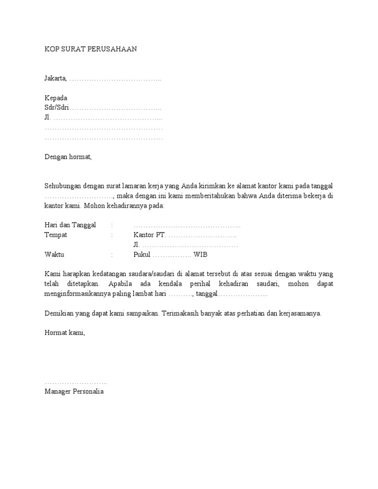 Misalnya jika kamu akan menjadi seorang penulis atau wartawan maka tulislah hobi yang relevan seperti membaca koran membaca buku bermain catur dan suka bersolialisasi. Contoh surat panggilan kerja atau diterima kerja di perusahaan setelah melamar dan wawancara berikut ini adalah contoh tentang contoh surat panggilan kerja atau diterima kerja di perusahaan setelah melamar dan wawancara seperti surat contoh yang tertulis di bawah ini. Gak perlu berpanjang lebar langsung saja ke contohnya ya hehe. Karena surat ini termasuk surat resmi maka pembuatan nya juga harus mengikuti aturan resmi seperti menggunakan bahasa yang formal singkat padat dan jelas menggunakan kop surat nomor perihal lampiran dan lain sebagainya. Format dari contoh surat lamaran kerja sangat mempengaruhi diterima tidaknya kita ketika sedang melamar di perusahaan. Maka dari itulah surat tersebut akan diterima oleh pihak pencari kerja yang diterima oleh perusahaan atau instansi tersebut.
