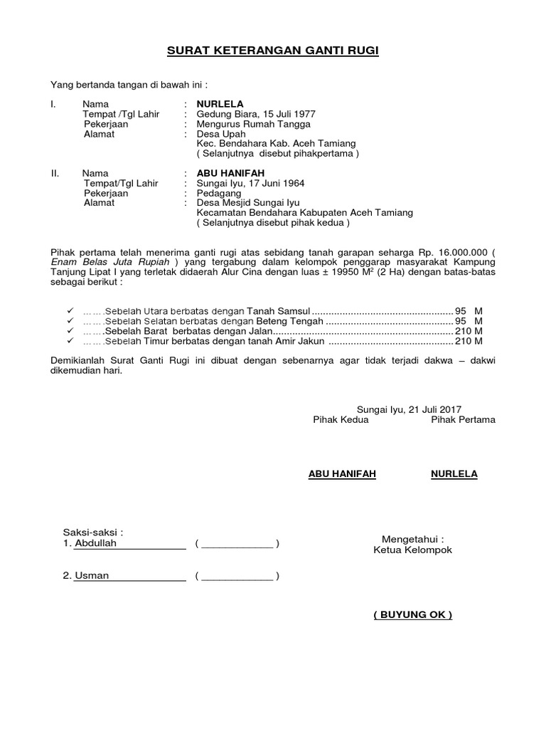 Contoh surat ganti rugi tanah. Bahwa pihak pertama telah menyerahkan sebidang tanah termaksud tanaman yang tumbuh di dalam lokasi tersebut seluas panjang 13 m x 7 m 91 m 2 kepada pihak kedua untuk dimiliki seterusnya dengan harga ganti rugi sebanyak rp. Demikian contoh surat tuntutan ganti rugi ini dibuat semoga bisa menjadi referensi yang baik bagi anda yang membutuhkan. Surat perjanjian ganti rugi tanah ini biasanya diajukan kepada pihak pemerintah jika pemerintah berencana membeli lahan milik anda untuk kepentingan pembangunan sarana prasarana umum. Yang membedakan hanya objeknya yaitu tanah. 3000000 tiga juta rupiah bayar tunaitanah lokasi tersebut di dusun i ladoa desa lantawonua kecamatan rumbia tengah kabupaten bombana dengan batas batas sebagai. Pada artikel sebelumnya kita telah membahas mengenai surat perjanjian jual beli rumah sederhanapada artikel contoh surat perjanjian jual beli tanah terbaru kali ini kita akan membahas mengenai topik yang hampir sama.