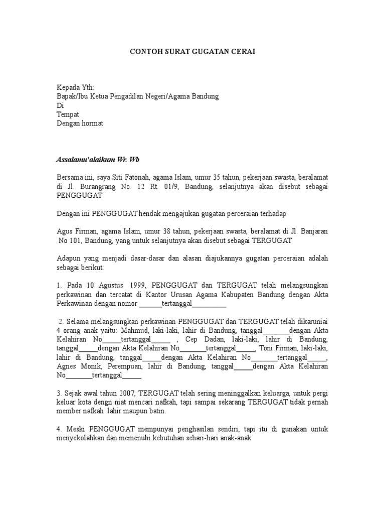 Contoh surat gugatan cerai. Bersama ini saya siti fatonah agama islam umur 35 tahun pekerjaan swasta beralamat di jl.
