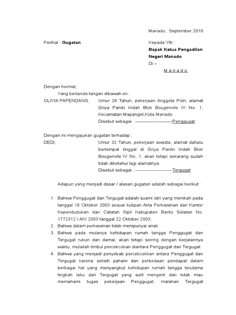 Ada banyak alasan yang mengharuskan sepasang suami istri untuk bercerai dan berpisah tergantung dari permasalahan keluarga masing masing. Identitas pihak pertama yang meminta cerai poin selanjutnya adalah menyebutkan identitas diri secara jelas pihak pertama atau pihak yang meminta perceraian. Surat gugatan cerai merupakan surat yang ditujukan kepada pengadilan agama oleh salah satu pihak dari pasangan suami istri yang ingin mengajukan perceraian. Bapakibu ketua pengadilan negeriagama bandung di tempat dengan hormat. Contoh surat gugatan perceraian di pengadilan negeri bagi yang belum mempunyai anak oleh bangdidav 07 sep 2018 posting komentar perselisihan dan percekcokan di dalam rumah tangga adalah suatu hal yang biasa terjadi dan menjadi bumbu agar hubungan suami istri menjadi lebih harmonis. Untuk mengajukan gugatan perceraian tentunya harus mengajukan beberapa persyaratan yang harus dilengkapi.