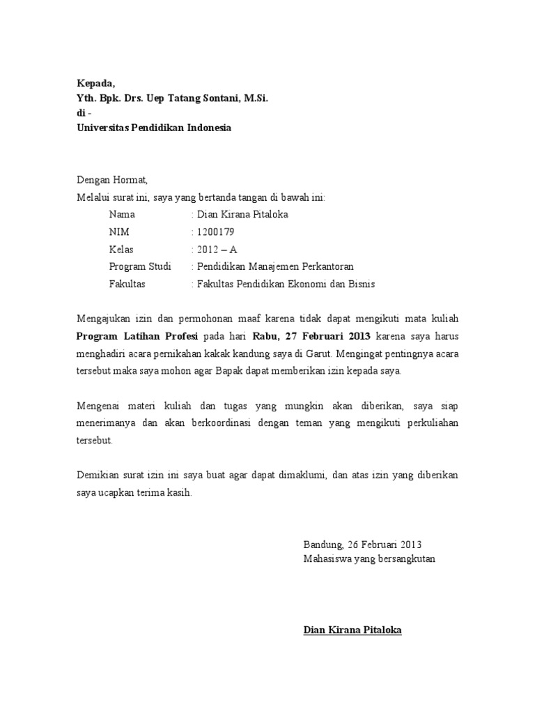 Karena tugas kantor 2 surat izin tidak masuk kuliah. Biar kamu gak bingung saat harus menulis surat izin kuliah untuk dosen pengampu mata kuliah berikut adalah contoh surat izin kuliah yang bisa kamu tiru. Asal tak bolos atau tidak masuk lebih dari empat kali di tiap mata kuliah maka mereka merasa aman. Karena pada artikel contoh surat izin tidak masuk kuliah ini akan kita bahas secara tuntas bagaimana menyusun suatu surat izin tidak masuk kuliah yang baik dan benar termasuk hal hal penting. Nama jenis kelamin nim alamat. Saat membuka artikel ini pasti kamu sedang membutuhkan contoh surat izin.