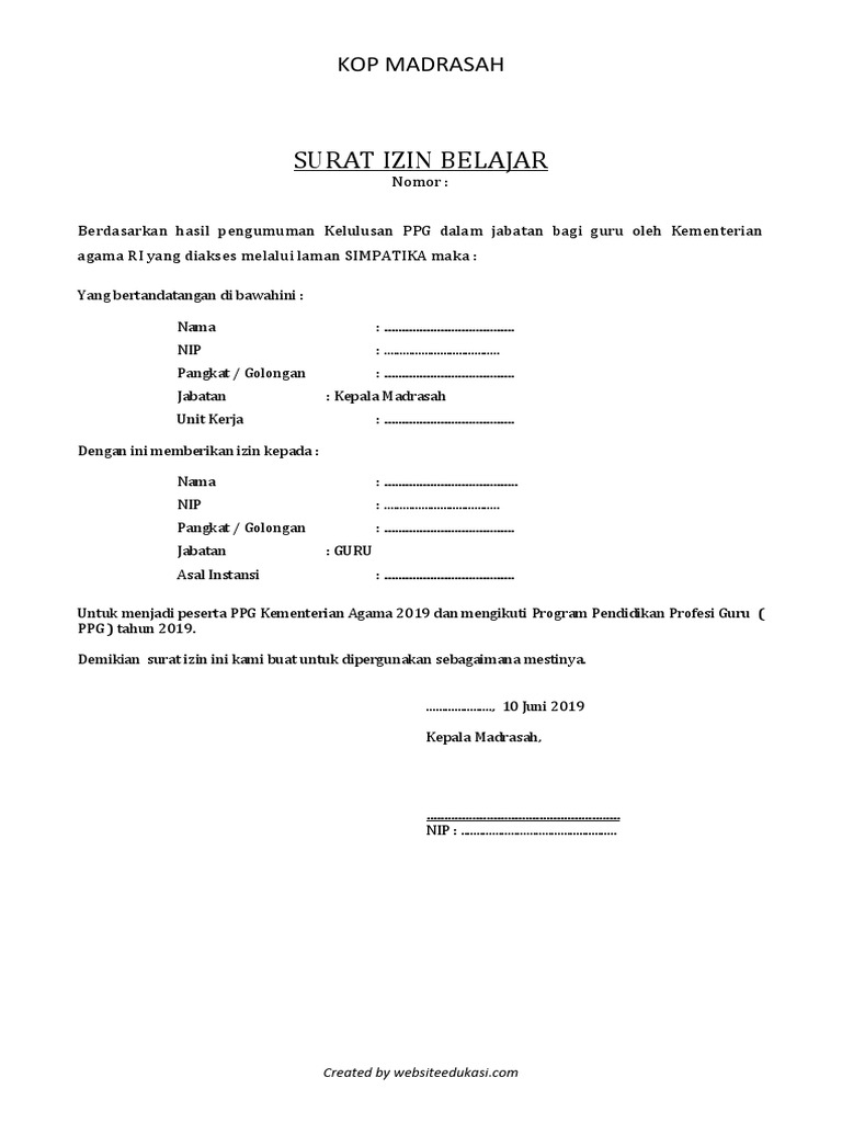 Hasil pretest ppgpggj 2018 sudah diumumkan melalui situs resmi sertifikasi guru dalam jabatan dan program ppg 2019 direncanakan akan di jadwalkan pada bulan oktober 2019. Contoh format surat keterangan izin belajar guru ppg salam hangat dan hormat. Termasuk yaitu mengurus surat izin untuk mengikuti kegiatan ppg sebab nantinya bagi guru yang akan mengikuti kegiatan ppg otomatis harus meninggalkan sementara tugas mengajarnya di sekolah atau madasah. Setelah dinyatakan lulus berkas yang harus dilengkapi salah satunya adalah format izin kepala sekolah ketua yayasan untuk mengikuti ppg ppgj 2018. Pada kesempatan sebelumnya kita telah membahas mengenai contoh surat lamaran kerja umum yang baik dan benarnah kali ini kita akan membahas mengenai contoh surat izin tidak masuk kerja yang benar 2019. Pada postingan ini saya akan berbagi contoh format surat izin kepada kepala sekolah atau ketua yayasan dalam rangka mengikuti kegiatan ppg ppgj tahun 2019 yang bisa anda unduh secara gratis.