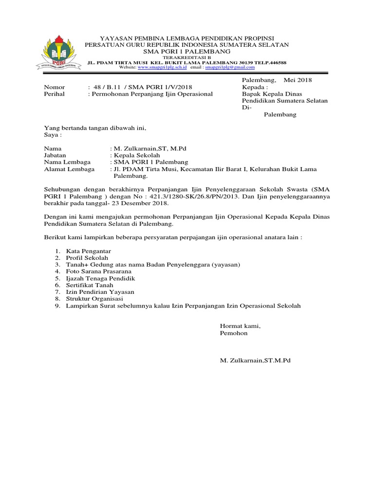Contoh surat izin operasional sekolah. 15 contoh surat permohonan izin untuk berbagai kepentingan walaupun penggunaan surat belakagan ini sudah semakin menurun namun masih ada beberapa contoh surat yang tetap digunakan hingga sekarang. Maka melalui surat ini camat sukaratu kabupaten tasikmalaya menyatakan tidak berkeberatan dan memberi izinrekomendasi kepada sdi palasari desa indrajaya kecamatan sukaratu untuk mengajukan ijin operasional kepada dinas pendidikan kabupaten tasikmalaya dengan catatan memenuhi pedomanpetunjuk pelaksanaan juklak dan petunjuk teknis juknis dari dinas pendidikan kabupaten tasikmalaya. Surat izin operasional sekolah merupakan surat yang diberikan olehdari dinas ke sekolah yang mengajukan. Ini merupakan tanda bukti bahwa sekolah itu resmi diakui dan tercatat dalam pendataan sekolah formal pada dinas pendidikan kabupatenkota setempat. Iin pendirian pendirian sekolah. Contoh surat permohonan perpanjangan izin operasional madrasah berdasarkan informasi dari seksi pendidikan madrasah deli serdang mengenai syarat syarat memperpanjang sio ramadrasah tahun 2015 bagi beberapa madrasah yang akan berakhir izin operasionalnya harus memperpanjang izin operasional madrasah masing masing.