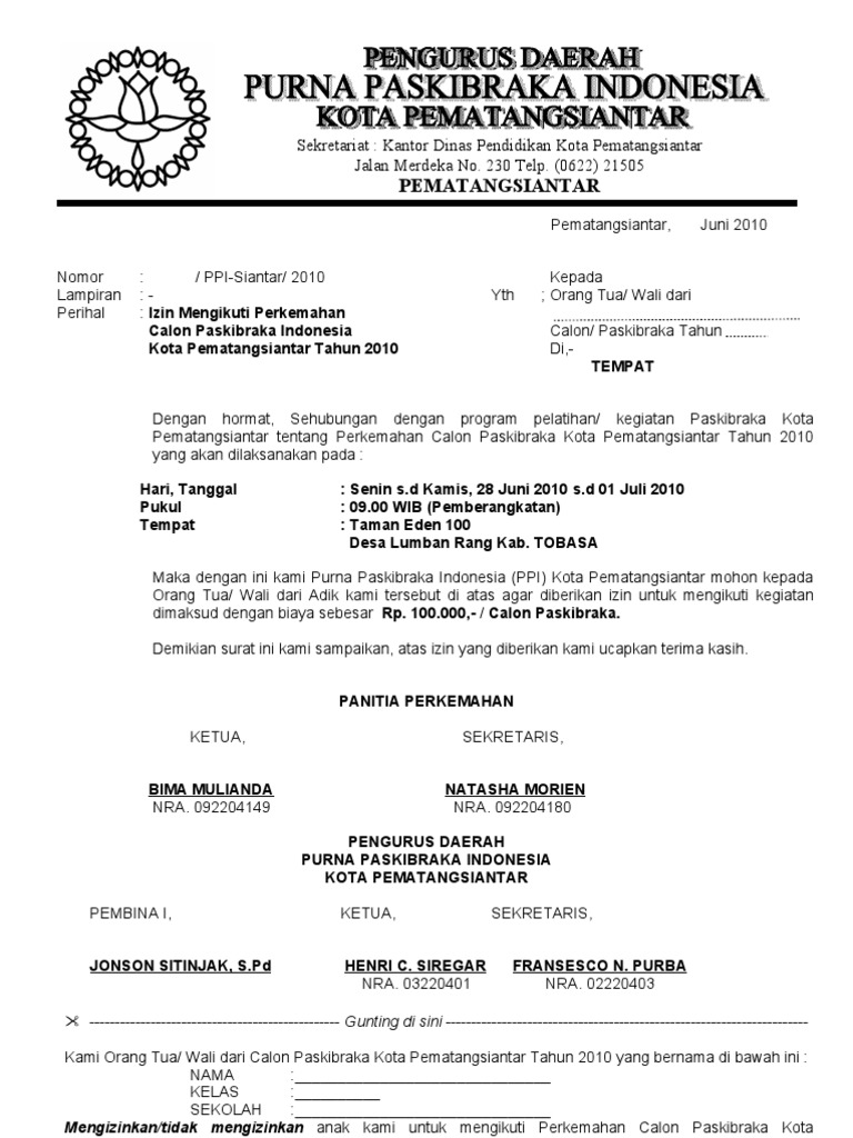 Mengizinkan tidak mengizinkan anak kami untuk mengikuti kegiatan lt2 pramuka di lapang bola jatireja. Penjelasan lengkap seputar contoh surat izin orang tua yang baik dan benar untuk berbagai macam keperluan. Demikian surat ini kami sampaikan atas perhatian dan kerjasamanya kami ucapkan terima kasih. Misalnya kegiatan outbound kemah pendakian gunung dan lain lain.