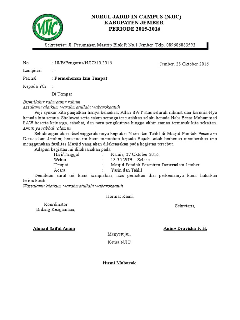Berikut contoh surat pengajuan ijin. Surat izin pemberian tempat ini adalah surat yang isinya menyatakan memberi izin kepada seseorang atau pihak tertentu untuk melakukan tindakan atau kegiatan di lokasi yang dimaksudkan sesuai dengan jadwal dan ketentuan yang dilampirkan. Madiun 5 agustus 2016. Bagimana cara membuat surat ijin dalam melakukuan sebuah kegiatan resmi bisa anda temukan dalam beberapa contoh surat permohonan izin kegiatan yang baik dan benar baik dalam dunia kerja peminjaman tempat usaha sampai dengan pribadi dan resmi. Jika sudah membuat surat peminjaman tempat berikutnya kita akan mendapat balasan surat berupa surat pemberian izin penggunaan tempat. Ketika kita atau suatu organisasi perusahaan dsb akan melakukan acara tertentu dan kita akan melaksanakan acara tersebut disuatu tempat dan kita akan meminjam atau menyewanya maka perlu untuk mengajukan permohonaan untuk meminjam tempat tersebut terlebih dahulu.