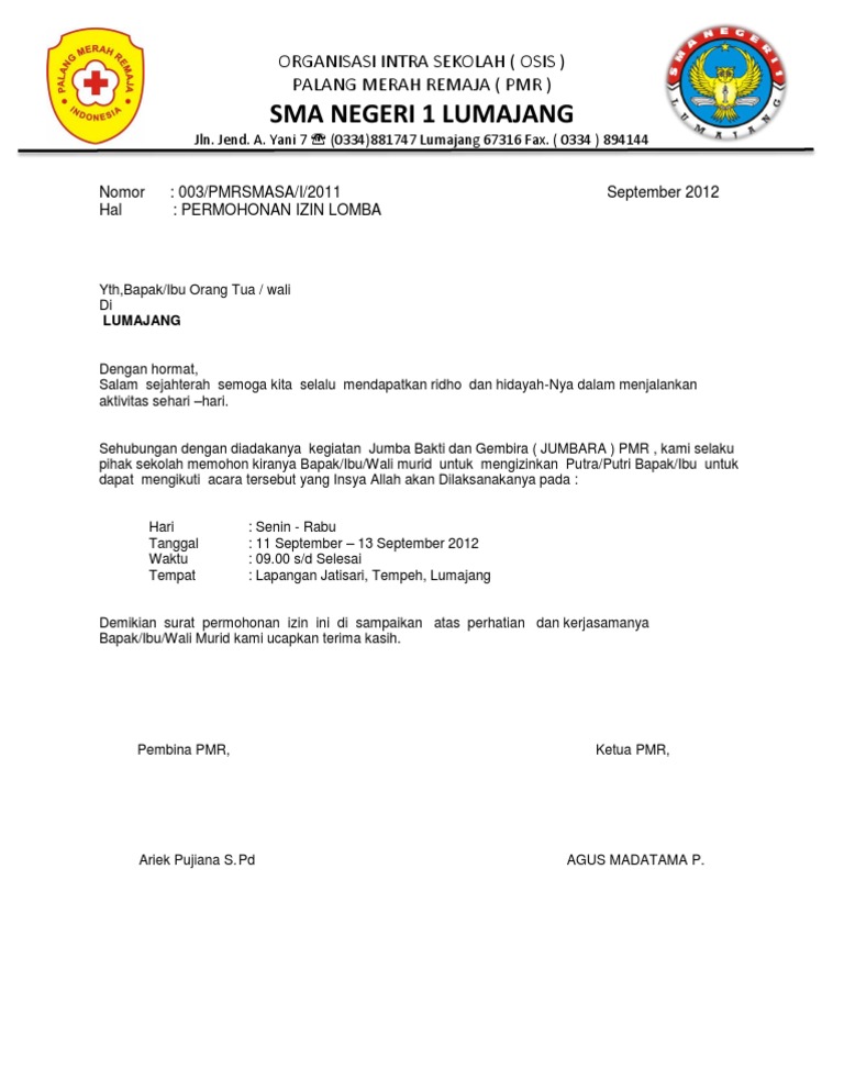 Contoh surat izin sekolah untuk kegiatan. Surat izin ini dibuat untuk mendapatkan persetujuan dari pihak kepala sekolah atau madrasah bahwa tim yang akan dikirim atau siswa yang ikut lomba merupakan resmi dari sekolah dan atas. Kamu akan membutuhkan surat rekomendasi atau surat izin dari pihak sekolah untuk mengikuti kegiatan lomba tersebut. Contoh surat permohonan izin seperti surat surat lainnya yang memiliki beragam jenis di sebabkan oleh tujuan pembuatan dan fungsi surat yang berbeda yang sebelumnya sudah di bahas di blog ini seperti surat permohonan bantuanpada kesempatan kali ini kami akan mencoba menulis surat permohonan izin yang pada intinya tujuan yang di miliki adalah sama yaitu isinya tentang pengajuan permohonan. Baik itu surat yang dipergunakan oleh perusahaan instansi pemerintahan lembaga organisasi dan perseorangan. Sedangkan untuk menulis sebuah surat permohonan izin kegiatan yang baik dan benar serta resmi untuk contoh surat permohonan izin kegiatan yang baik dan benar harus melihat cara berikut ini. Contoh surat pemberitahuan setiap instansi sekolah pemerintah desa pemerintah daerah kabupaten pemerintah pusat organisasi komunitas perusahaan instansi pemerintah dan lembaga negara selalu melakukan kegiatan surat menyurat.