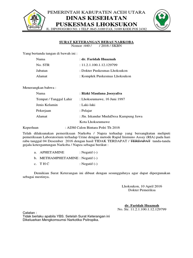 Temukan informasi lengkap tentang surat keterangan bebas narkoba dari rumah sakit pemerintah. Contoh surat keterangan bebas narkoba. 6 setelah selesai pengambilan kesimpulan kemudian petugas akan mengetik hasil uji anda dalam bentuk surat keterangan bebas narkoba skbn. 15 contoh surat keterangan bebas narkoba paling lengkap salah satu berkas pendukung yang bisa digunakan untuk melamar pekerjaan melanjutkan pendidikan atau kebutuhan lainnya adalah surat keterangan bebas narkoba. Namun jika indikatornya hanya terlampaui 1 garis saja maka anda dinyatakan positif narkoba mengandung narkoba terjangkit. Adapun di bawah ini adalah beberapa contoh surat keterangan bebas narkoba yang bisa didapatkan baik di klinik kepolisian ataupun di laboratorium.
